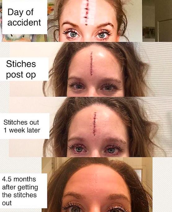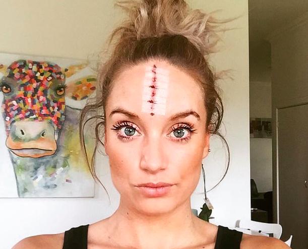 佐伊分享了一张做过额头缝合手术后的照片,照片上她的前额血迹斑斑,目前处于正在康复的状态。